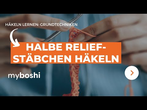 Hier zeigen wir, wie du eine halbes Reliefstäbchen häkelst (von vorne eingestochen).